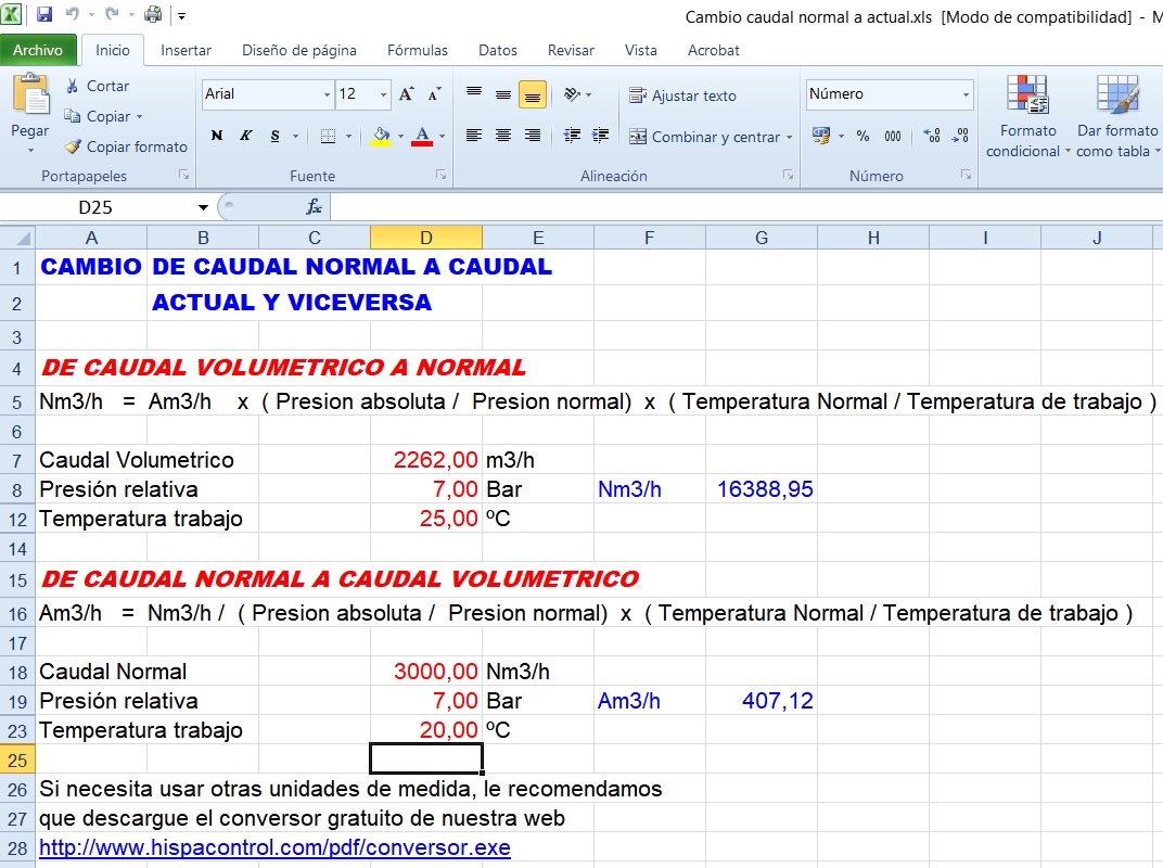 Conversión de caudal normal a volumétrico y viceversa para gases Fichero Excel, para convertir en función de la temperatura y la presión las lecturas de caudal normal en caudal volumétrico y de caudal volumétrico en caudal normal, para gases Documento: Cambio caudal normal a actual.xls |